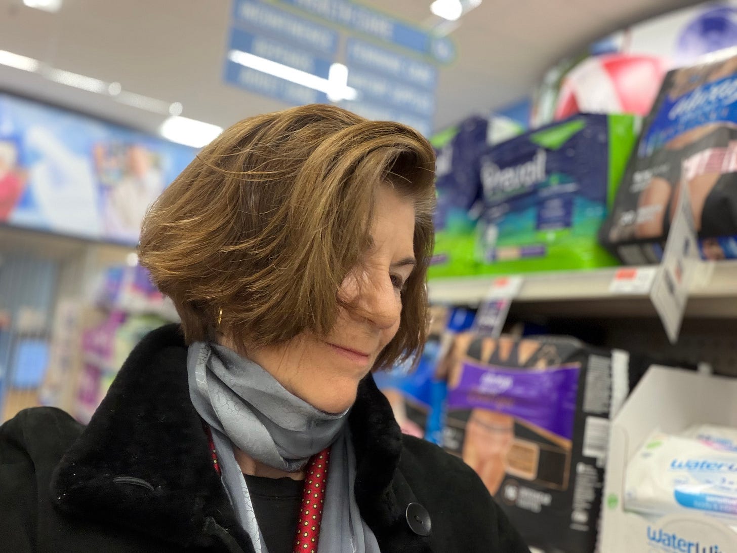 We also trade anecdotes about the process of purchasing this product at our local small drug store, joking that as we gray haired women struggle to the cash register with a jumbo package of Depends, surely the clerk must wonder if we are buying them for ourselves.